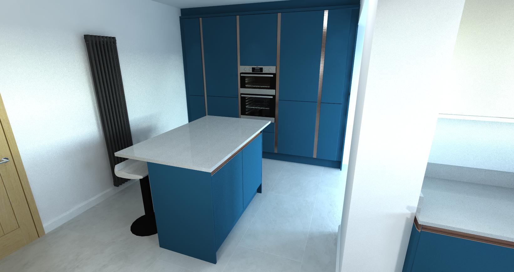 Introducing the Porter Matt Hartforth Blue kitchen, a sleek and modern design featuring lacquered, handleless doors with a refined brushed copper trim. Elevating the aesthetics, the kitchen boasts white shimmer quartz countertops, expertly supplied & seamlessly installed.